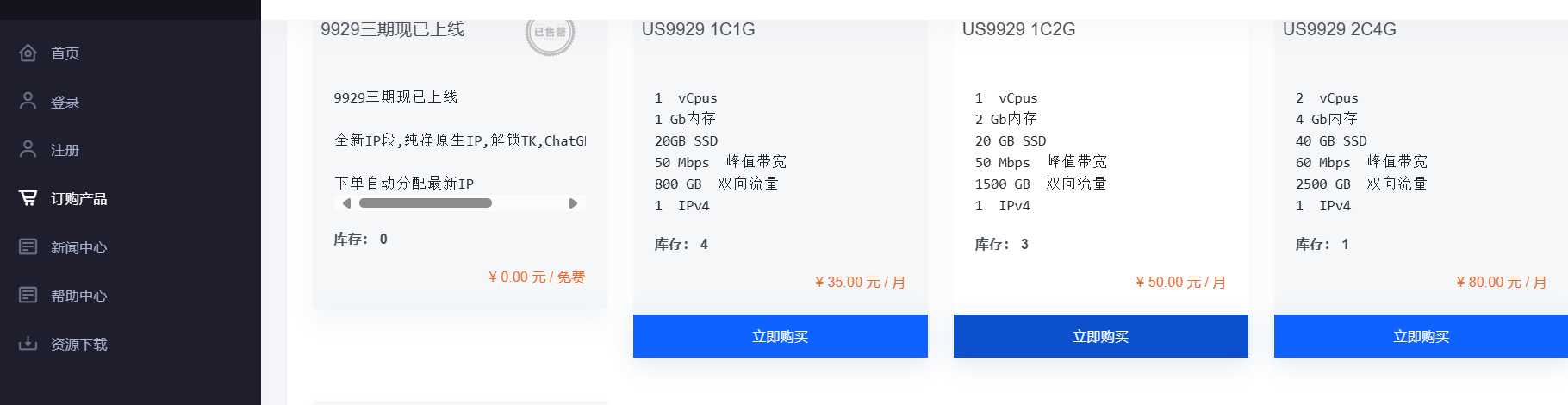 | 内存 | CPU | SSD | 带宽 | 月付 | 购买 |